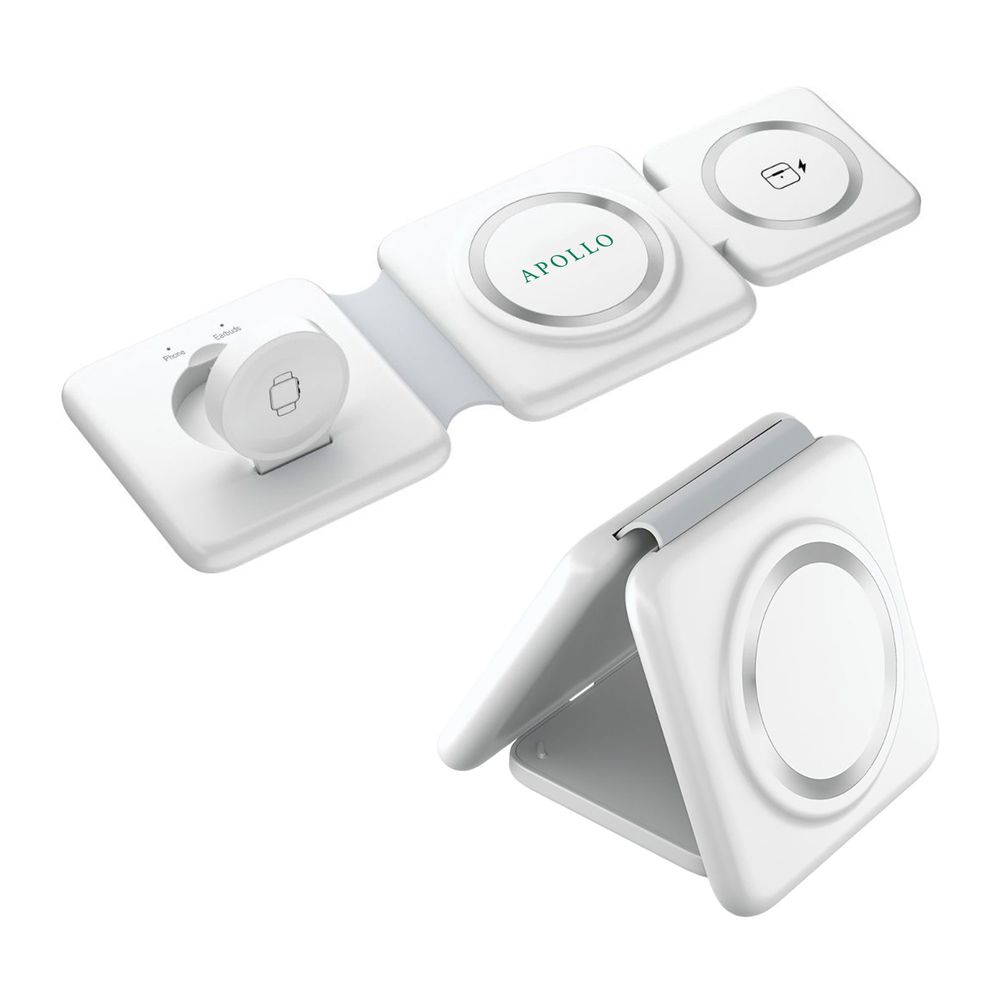 Say goodbye to bulky chargers and hello to a new power fold wireless charing station. Featuring a unique, single fold design, this charger easily slips into your pocket or bag, making it the perfect travel companion. The wireless magnetic phone charger can reach speeds of up to 15 watts and securely holds a phone in place; and the earbuds and Apple Watch charger complete the package by seamlessly folding in and out as needed. Folded Size: 1" x 1". Flat size: 2.8" W x 3.35" H.