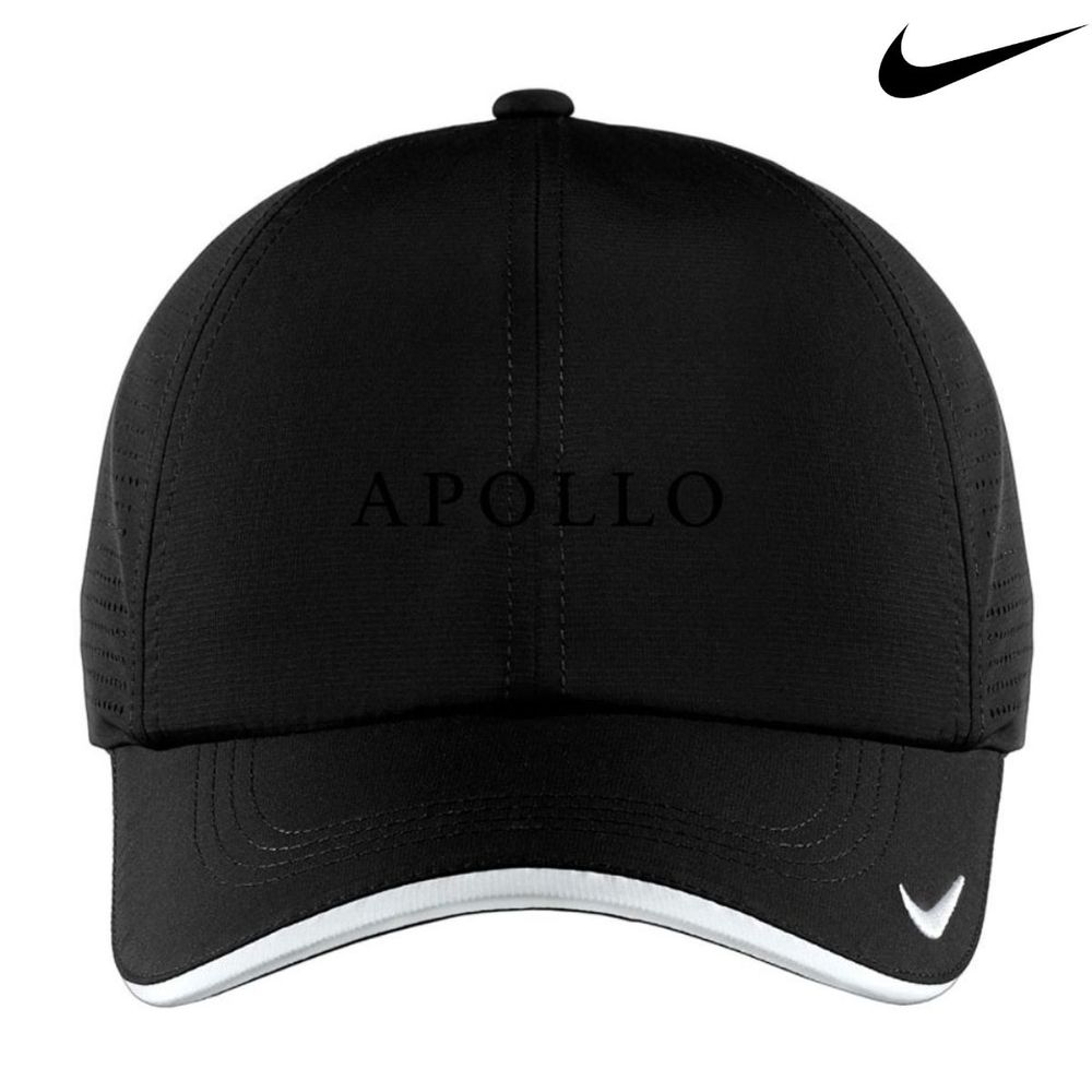 Maximum breathability is achieved with Dri-FIT moisture management technology and perforated mid and back panels. A contrast underbill reduces sun glare. This 6-panel cap has an unstructured, low profile design with a hook and loop closure. The contrast Swoosh design trademark is embroidered on the bill and center back. Made of 100% Dri-FIT polyester. Apollo logo is embroidered on front center of cap.